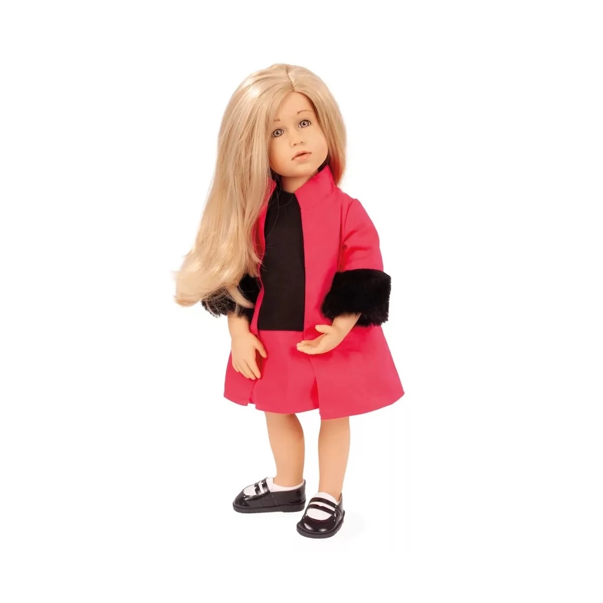 A Götz Happy Kidz Svenja egy magas minőségű, több ízülettel mozgatható állóbaba, szőke hajjal, olívazöld szemekkel és stílusos rózsaszín-fekete ruhában. Az elegáns plüssszegélyes kabát és a divatos mokaszin cipő teszik teljessé a gondosan megtervezett megjelenést. Tökéletes kiegészítő minden babagyűjteményhez, ugyanakkor stílusos játék is a gyerekek számára.