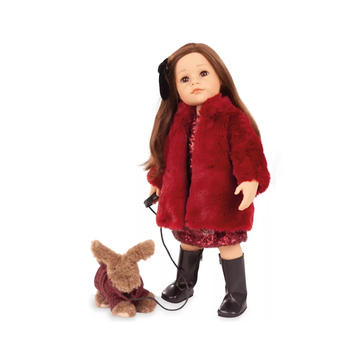 Hannah elegáns flitteres ruhát visel, melyet magas minőségű plüsskabát tesz teljessé. Fekete csizma és stílusos hajmasni egészíti ki megjelenését. Hűséges kiskutyája, Polly, bordó köpenyben és pórázzal érkezik. Ez a limitált kiadású szett kivételes kidolgozásával nyűgöz le – nemcsak egyedi gyűjtői darab, hanem igazi kincs a minőséget értékelő babarajongók számára.